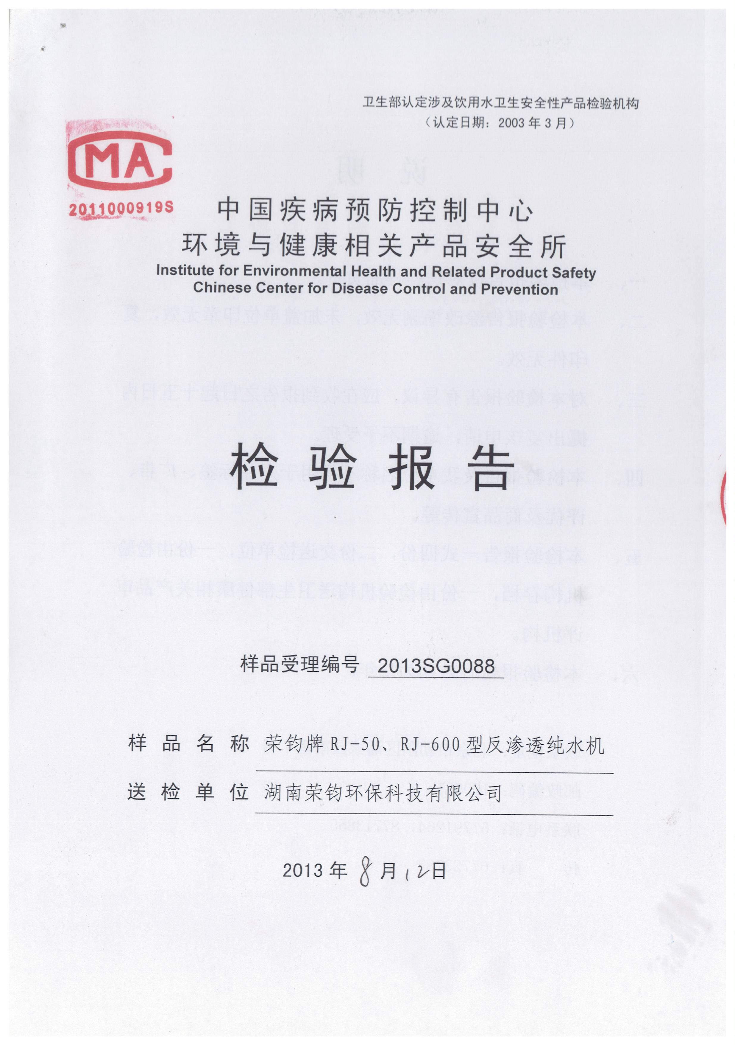 熱烈祝賀榮鈞公司獲得反滲透純水機(jī)檢驗(yàn)報(bào)告證書