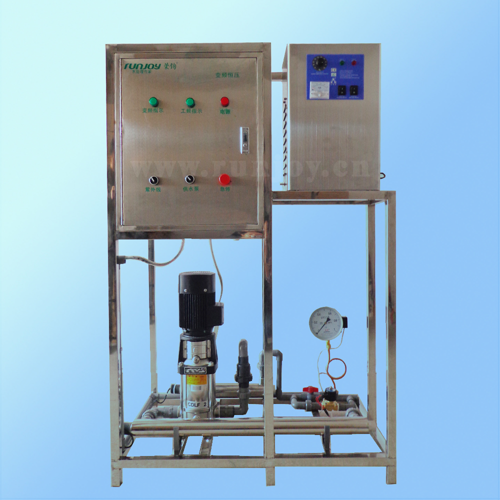 采用臭氧和紫外線殺菌技術,對純凈水進行消毒、滅菌和保鮮,防止水質受到二次污染。在供水方面采用變頻控制器來供給水,確保水壓、水流量穩定